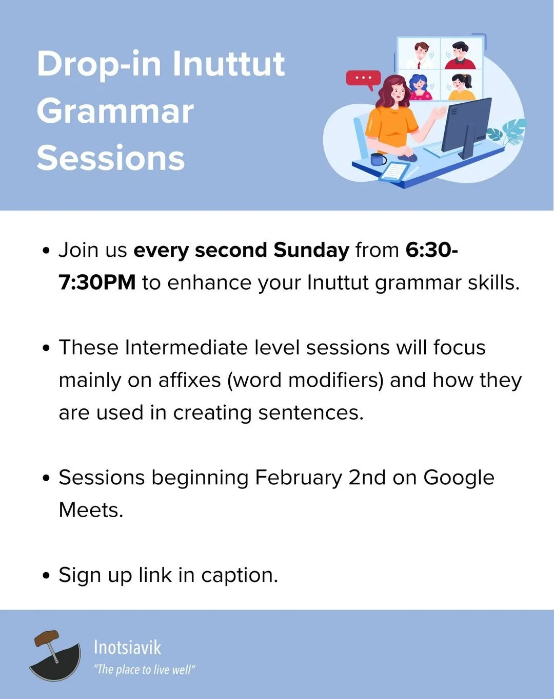 Online Beginner Inuttut lessons will be happening on September 10th, 11th, and 12th. Stay tuned in to our Facebook page for registration details.